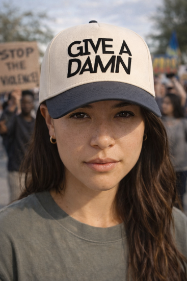 The "GIVE A DAMN" cap keeps it simple and strong with oversized black lettering across...