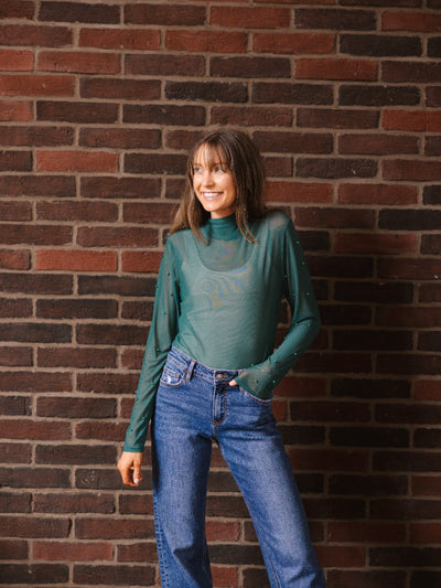 Mock Neck Mesh Top with Pearl Detail, Green