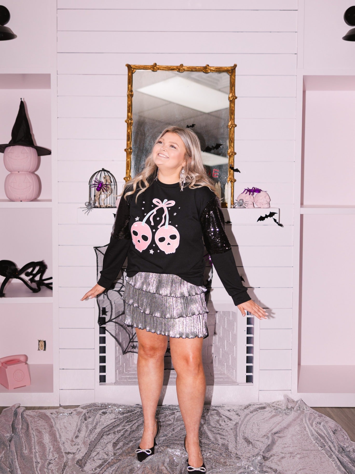 Cherry Skull on Light Weight Sequins Sweatshirt, Black