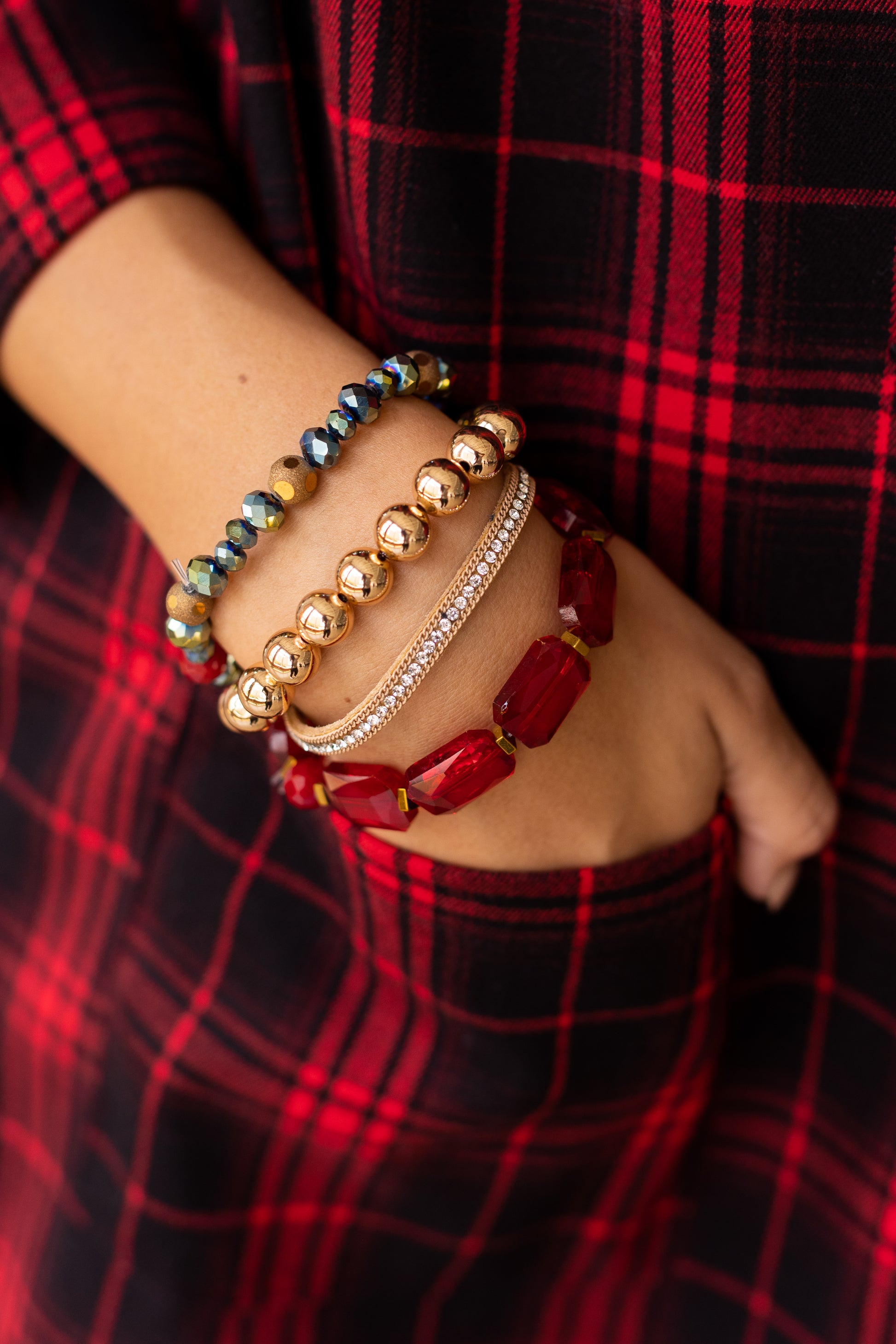 Designed for both style and comfort, the bracelet is adjustable to fit various wrist sizes and secures with a sturdy clasp, ensuring a secure and comfortable fit. Let your holiday spirit shine bright with the Christmas Babe Four Strand Bracelet – a charming accessory that captures the essence of Christmas joy and makes you the belle of the holiday ball.