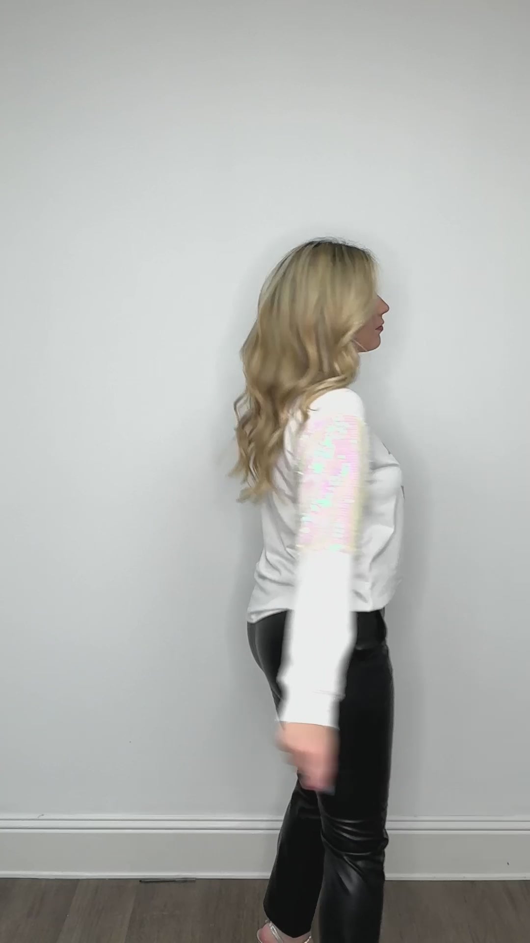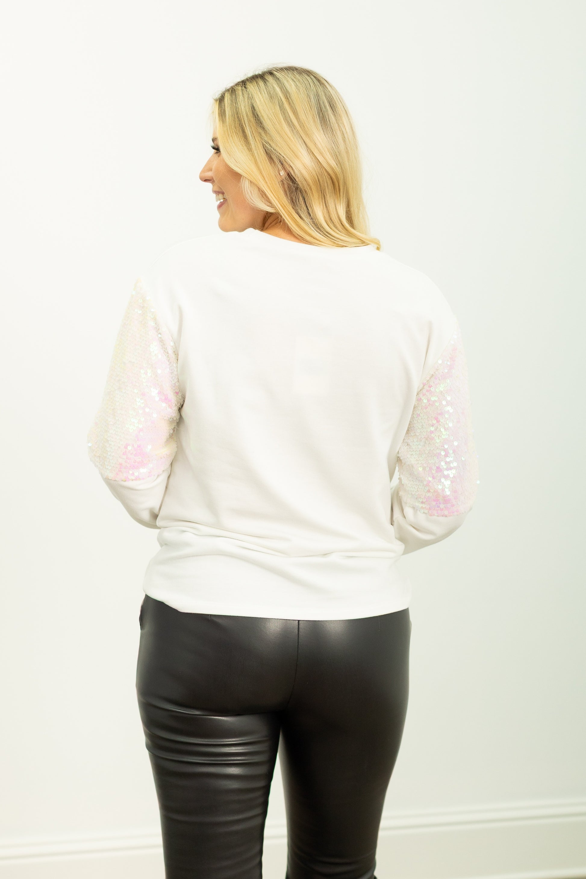 This lightweight French terry sweatshirt blends everyday comfort with a festive twist. Designed with high-stretch fabric for easy movement, it features sequin-accented sleeves lined on the inside to ensure a smooth, itch-free feel against the skin. The classic crew neckline and standard t-shirt length make it easy to wear solo or layered. Soft, breathable, and thoughtfully detailed, it's the perfect piece to add a little sparkle to your day without sacrificing comfort.