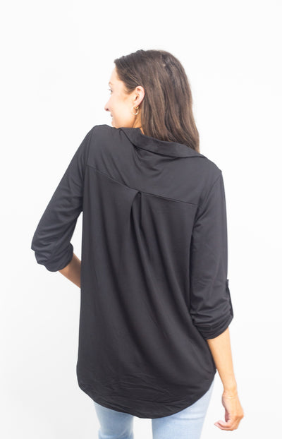 This versatile and stylish top features a relaxed fit for ultimate comfort. Designed with high stretch for flexibility, we recommend sizing down for a snugger fit. The V-neckline adds a flattering touch, while the adjustable sleeves offer functionality—wear them long or roll them up using the convenient button near the elbow for a customized look. Perfect for everyday wear with a polished twist.