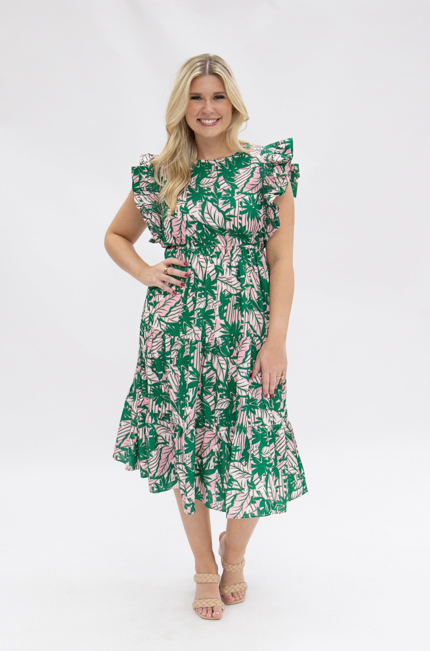 This vibrant midi dress features a bold tropical-inspired print with feminine ruffle sleeves and a flattering smocked waist that defines your shape while staying comfortable. The tiered skirt adds soft movement and flow, making it perfect for brunches, vacations, and special events alike. It's a standout piece that feels effortless, polished, and ready for wherever the day takes you.