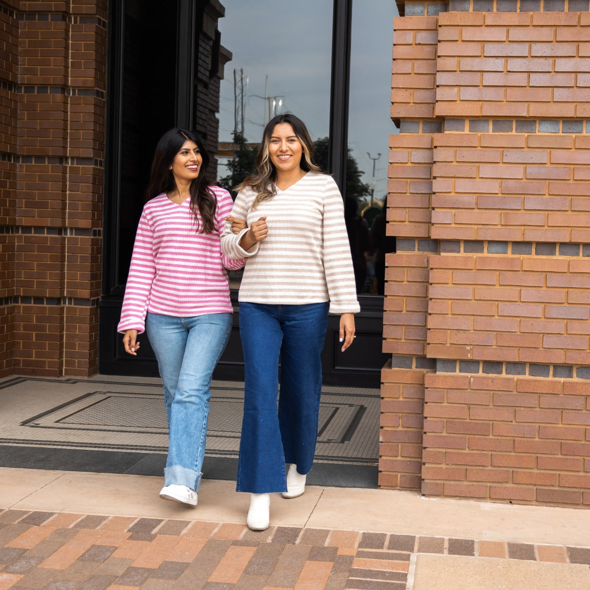 Pair it with tailored trousers for a polished office look, or team it with your favorite jeans and sneakers for a chic and relaxed ensemble. The "Pink Stripe Pullover Sweater" embodies the art of combining versatility and style, inviting you to embrace its timeless charm while expressing your personal fashion sense.