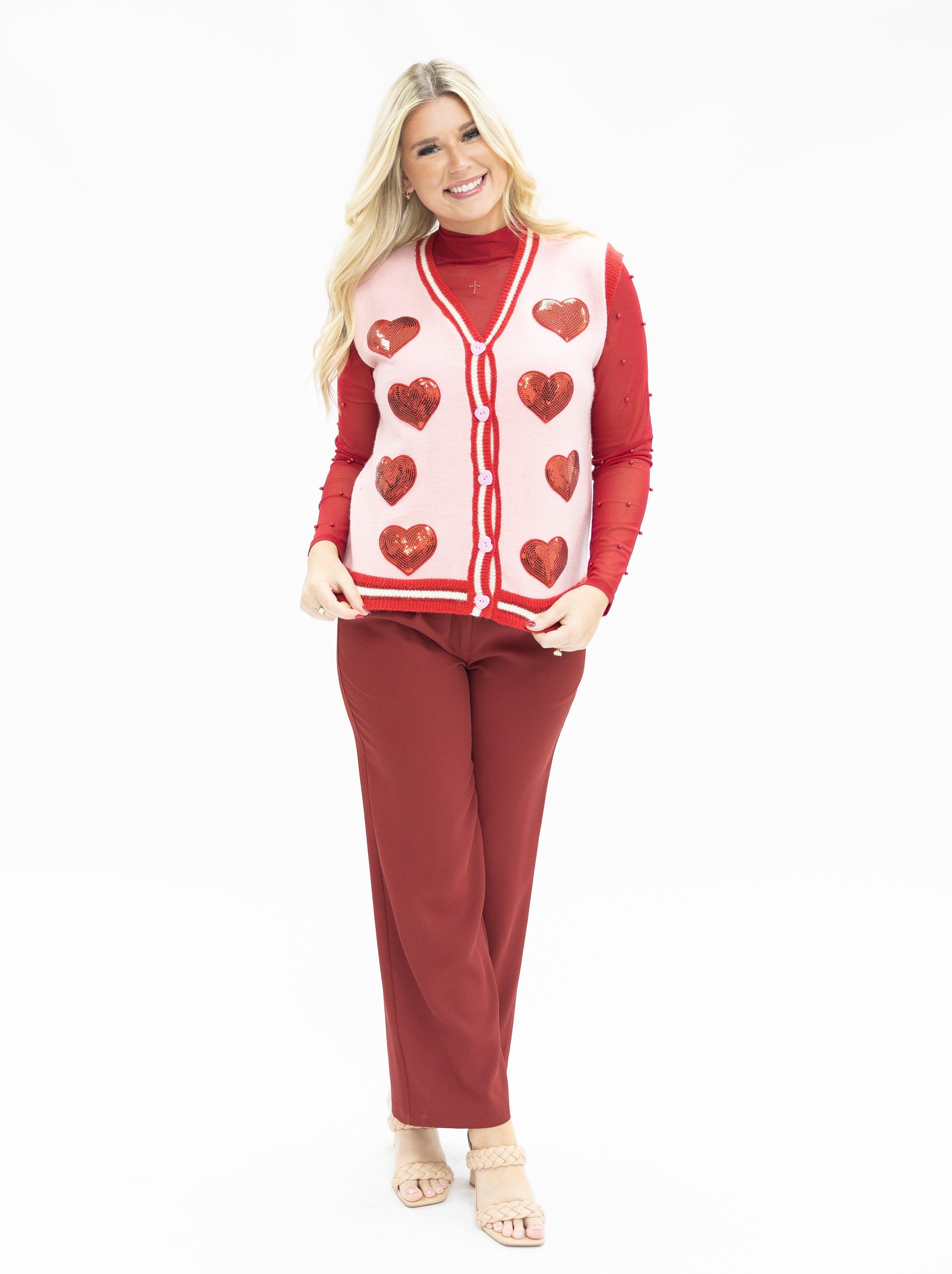 Turn up the charm with our Sequin Hearts on Pink Sweater Vest! This playful, vintage-inspired piece features sparkling red sequin heart appliques on a soft knit fabric, complete with red trim and button-front closure. Perfect for layering over blouses, turtlenecks, or graphic tees, it adds a fun and festive touch to your Valentine's look—or anytime you're feeling extra sweet.