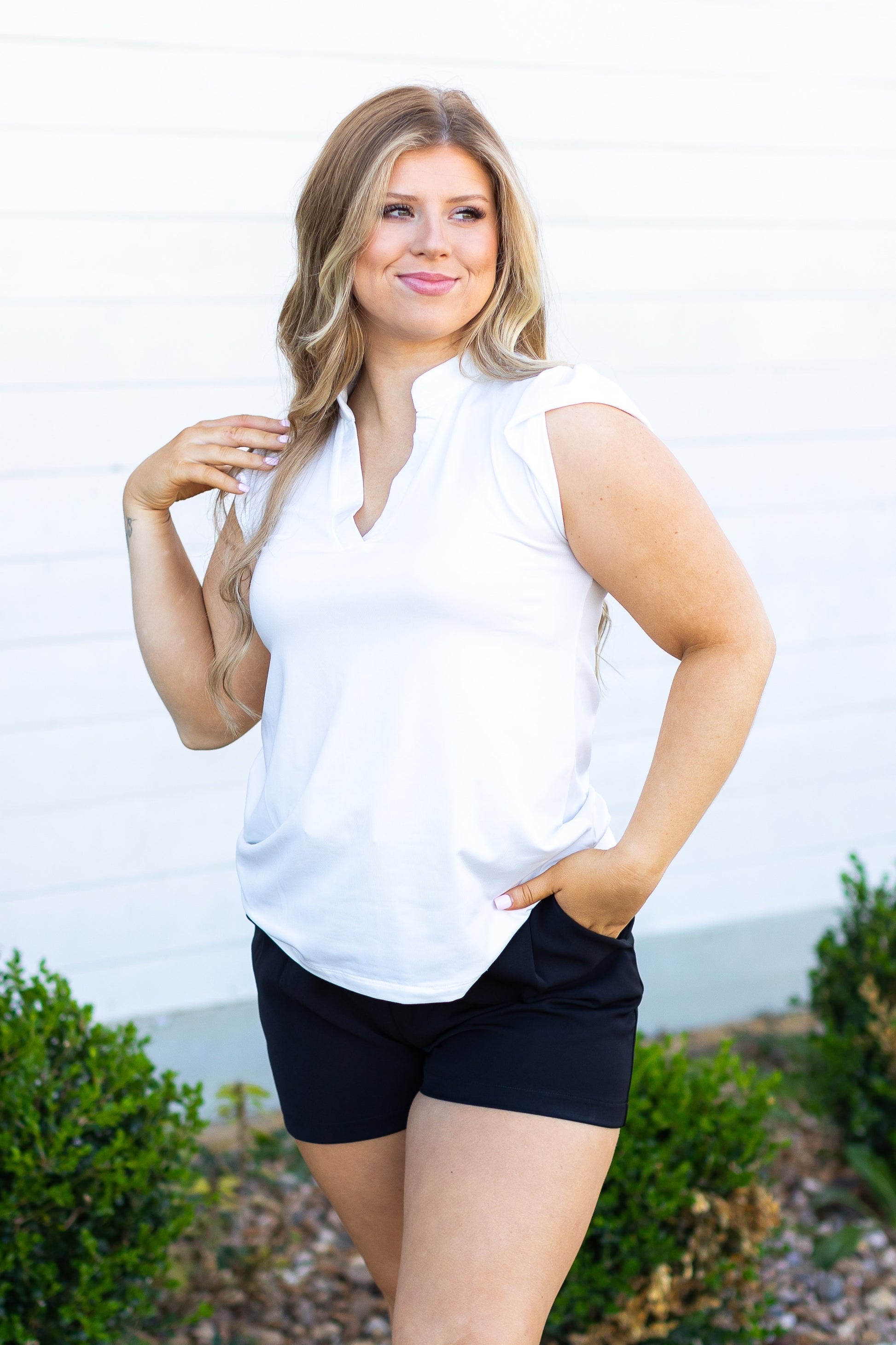 Designed with real women in mind, this top features flexible fabric and a longer short sleeve that covers the upper arm for a sleek silhouette. The deep V-neck adds femininity while the breathable material keeps you cool and confident.