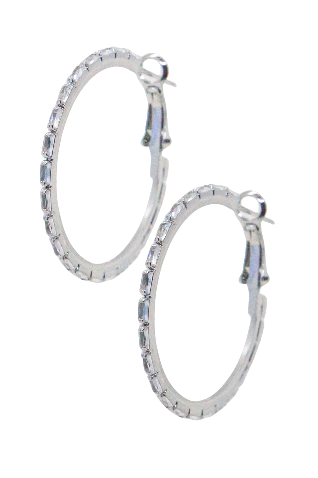 Product Details: Material: Silver-plated/Faux Crystals Design: Small crew hoop earrings Length: 1" Color: Silver (shades may vary...