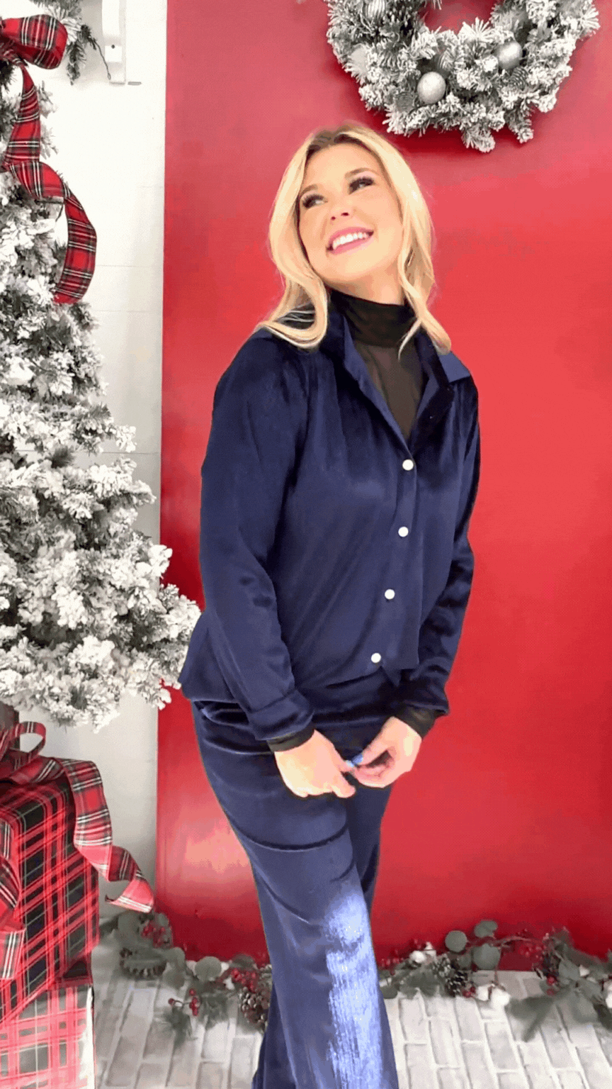 Velvet Straight-Leg Pants, Navy